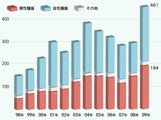 2009年手術件数 全手術件数:461例(入院;268例、外来:193例) 皮膚悪性腫瘍:184例(うち悪性黒色腫48例、有棘細胞癌57例、Paget癌18例、基底細胞癌42例) 皮膚良性腫瘍:277例 センチネルリンパ節生検:73例