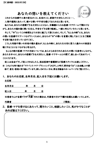 当院では「あなたの想いを教えてください」という文書を用いて、取り組みを推進しています。記入された場合は、担当医師や看護師など医療スタッフにお渡しください。