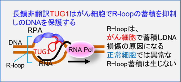 名古屋大学大学院医学系研究科 腫瘍生物学 近藤豊教授らの研究グループは、タンパク質に翻訳されないRNA(長鎖非翻訳RNA)の一つであるTUG1が、がん細胞のDNAを損傷から保護し増殖を助ける分子機構を解明しました(図1)。そしてTUG1の働きを阻害するアンチセンスオリゴヌクレオチドにより腫瘍細胞のDNAが損傷し、細胞死が誘導されることを見出しました。さらにTUG1を高発現している膠芽腫細胞を用いた脳腫瘍モデルマウスで、TUG1を抑制する核酸医薬(antiTUG1製剤)と膠芽腫の標準治療薬テモゾロミドの併用治療を行った結果、顕著な抗腫瘍効果が得られました(図2)。この結果より、antiTUG1製剤は難治性のがんである膠芽腫において有効な治療薬となる可能性があります。