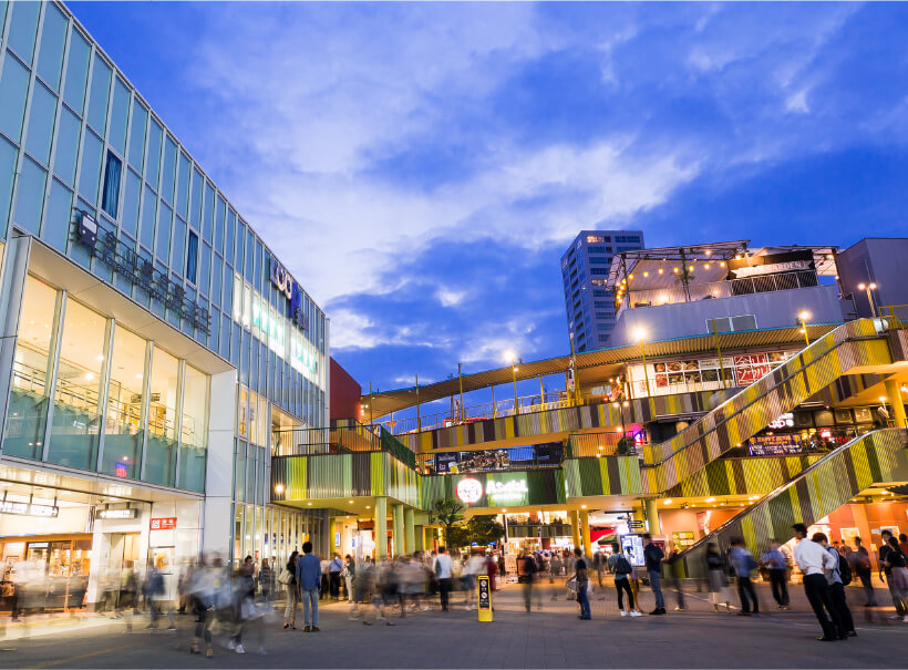 名大病院の最寄り駅、「鶴舞」からひと駅。金山駅に隣接する「アスナル金山」には、ファッション・雑貨・飲食店の他、ライブスペースもあります。