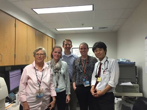 最後に回らせていただいた循環器内科では、CICUにて実習をさせていただきながらカテ室に出入りして色々な症例を見学させていただきました。ここでは中国からの留学生と一緒に実習をしたのですが、彼女の知識の豊富さ、また内科学の奥の深さを思い知らされました。劣等感を感じることもままありました。しかしながら、私自身の循環器内科への興味と熱意は多くの人を巻き込んで、たくさんのかけがえのない出会いと思いやりと熱意あふれる教育という最高の形で実を結びました。最も勉強になったのは、1か月という長いスパンで実習を行ったことで、急性期治療の治療方針の決定の流れを追うことができたことです。もちろん、日本でのこれまでのポリクリで色々な科を回り、医療者の意思決定の過程は見てきたつもりでした。しかし、Swan numbersや他の検査値、また患者の全身状態を把握し、患者はDryなのかWetなのか、infectionの可能性を念入りに調べ上げていき、また今後どのような検査がいつどのような時間間隔で必要になってくるのか、ここまで心機能が低下してきたらIABPが必要になってくるといった'現状とその先を読む'力というものを勉強させていただきました。さらに、日本でも最近承認されたTAVRという経皮的弁置換術を2例見学させていただきました。2例とも2時間を切る速さで、しかも術後に症状の大幅な改善を認め合併症もないという完璧な手技で感動しました。週に6日、朝6時から夜6時までという過酷なスケジュールでしたが、循環器内科の忙しさ、頭の使いどころ、そしてかっこよさを存分に堪能させていただけた1か月間でした。