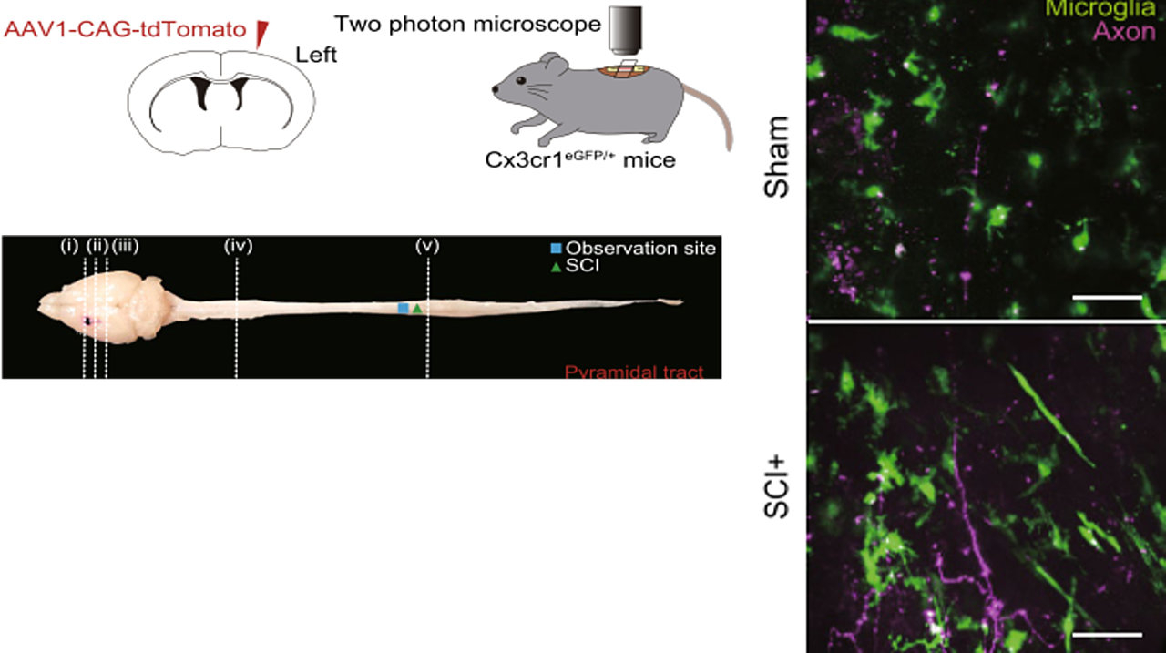 ミクログリアは中枢神経系の免疫担当細胞であり、損傷後の環境調節や神経回路の再構築に関与して回復過程を左右します。マウスモデルの脳および脊髄の生体イメージングによって脊髄損傷後の脳神経細胞の神経活動の変化や損傷軸索とミクログリアとの相互作用を見出しました。