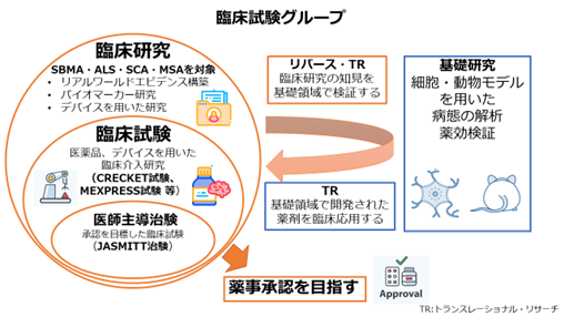 当グループでは運動ニューロン疾患、中でも球脊髄性筋萎縮症(SBMA)、脊髄性筋萎縮症(SMA)の病態解明と、治療法の創出につながる研究に取り組んでいます。ポリグルタミン病の一つでもあるSBMAについては早期病態・外的因子関連病態の解析、オルガノイド研究、個体細胞レベルでの研究とともに、RNA・タンパク質標的治療の開発を行なっています。またAI創薬研究、広く応用可能なポリグルタミン病の治療シーズや中枢神経のドラッグデリバリーシステムのプラットフォーム開発も進めています。SMAに関しては、患者由来細胞、トランスジェニックマウスを用いて発症起点となる病態の検証を行うとともに、一方で患者レジストリ・コホート研究を立ち上げ、疾患重症度や薬効判定のバイオマーカーの開発や、疾患修飾因子の解明にも取り組んでいます。
