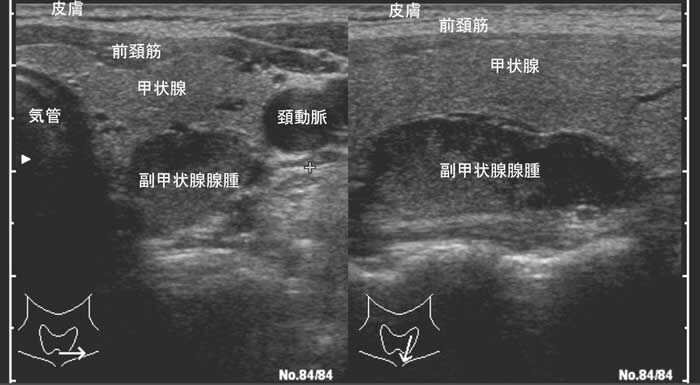 次に4つある副甲状腺のどれが腫れているかを、画像診断で調べます。最初は頚部超音波検査が、痛みのまったくない検査で精度も高いので第一選択として行われます。特殊なアイソトープ検査(99mTc-MIBI シンチグラムという検査)も診断精度の高い検査です。その他の検査方法として、頚部・縦隔CT検査、MRI検査などが行われます。