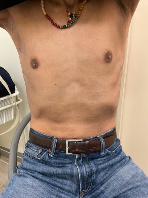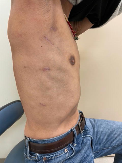 多くの心臓手術は、胸骨正中切開(図1)が心臓への標準的なアプローチですが、本手術では、胸骨を切らずに、右胸部の肋骨の間からアプローチします(図2)。右腋窩(わき)の下に、約3~4cmの皮膚切開を置きます。その他に1cm程度の創を数か所使用し、内視鏡カメラもしくは手術支援ロボットを用いて手術を行います。
