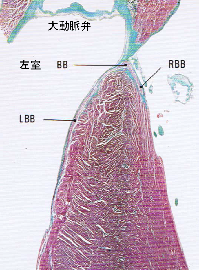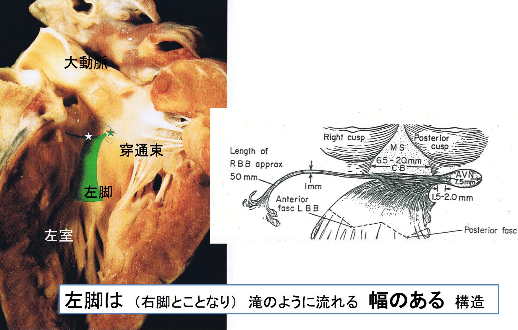 TAVI後の合併症として伝導障害は頻度の高いものであり、その中でも左脚ブロックが最も多いとされています。(参考文献①)これは伝導路の解剖学的特性に起因します。右房にある房室結節から連なるHis束が膜性中隔を通り左側へと走り、膜性中隔と筋性中隔の間に出てきます。ここで左脚に分枝しますが、ここは大動脈無冠尖と右冠尖の間の基部と非常に近いところにあります。TAVI弁による圧迫によって、この伝導路に様々な程度で機械的な障害が起こり、伝導障害が発生します。また、この伝導路には個人差があることが知られており、膜性中隔が短い患者さんでは伝導障害がより発生しやすいとされています。(参考文献②)