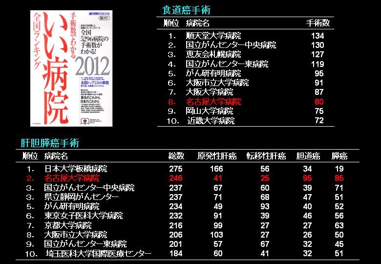 その他、大腸癌は手術数217で全国30位(本の記載は手術数149で121位)、胃癌は手術数115で全国83位(本の記載ではランキング外)が正しい数字です。以上のことは名古屋大学病院のHPおよび週刊朝日MOOKのHPにも掲載されています。