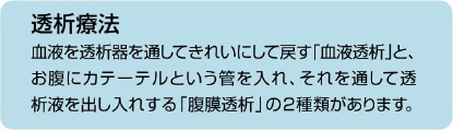 腎臓に代わって人工的に体の血液を浄化する方法が透析療法とよばれています。透析療法を受けることにより生命を維持することができ、ある程度までは普通に生活することが可能になります。しかし透析療法は腎機能を回復させる治療法ではなく、腎臓のはたらきを完全に補うものでもありません。従って腎臓移植を受ける場合を除いて生涯つづける必要があります。 透析療法には血液透析と腹膜透析の2種類があります。